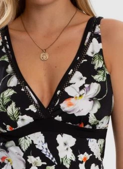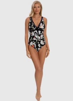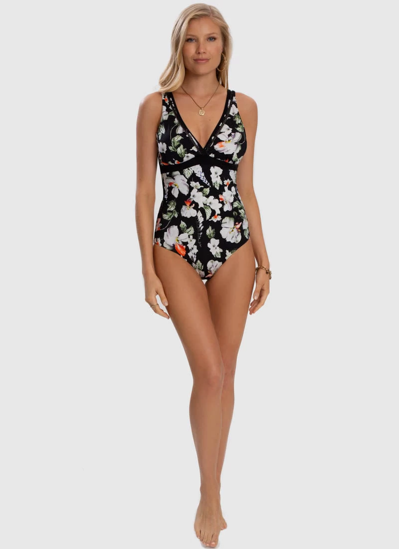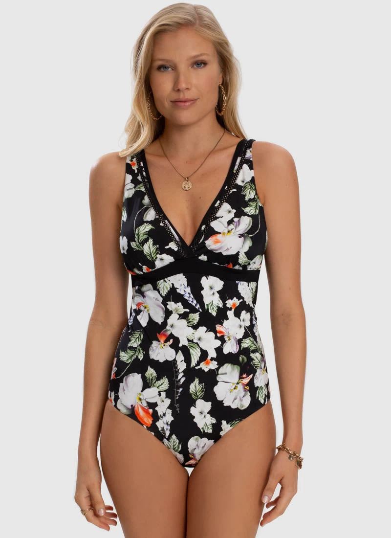 The Arcadia DD/E Cup One Piece by Aqua Blu Australia embodies minimalist design with a moderate V neckline, wide adjustable shoulder straps and back clasp. The ultra-soft luxury fabric, removable cups, underwire support and front power mesh is designed to shape and support the body.