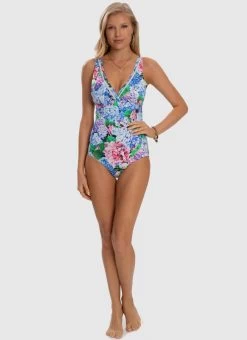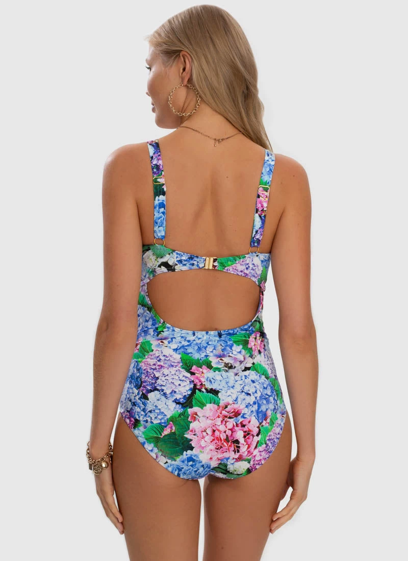 The Blossom DD/E Cup One Piece by Aqua Blu Australia embodies minimalist design with a moderate V neckline, wide adjustable shoulder straps and back clasp. The ultra-soft luxury fabric, removable cups, underwire support and front power mesh is designed to shape and support the body.