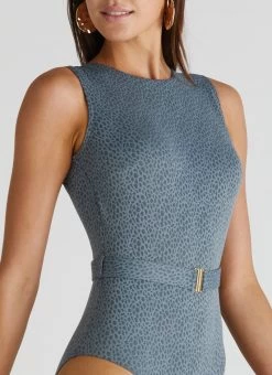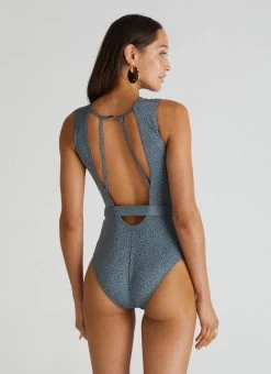 The Dove Brianna One Piece by Aqua Blu Australia sets a new standard for swim constructed in luxurious textured jacquard, with a high neck collar and cross back opening. The luxurious four-way stretch textured jacquard, removable cup support and elastic shelf support is designed to shape and support the body.