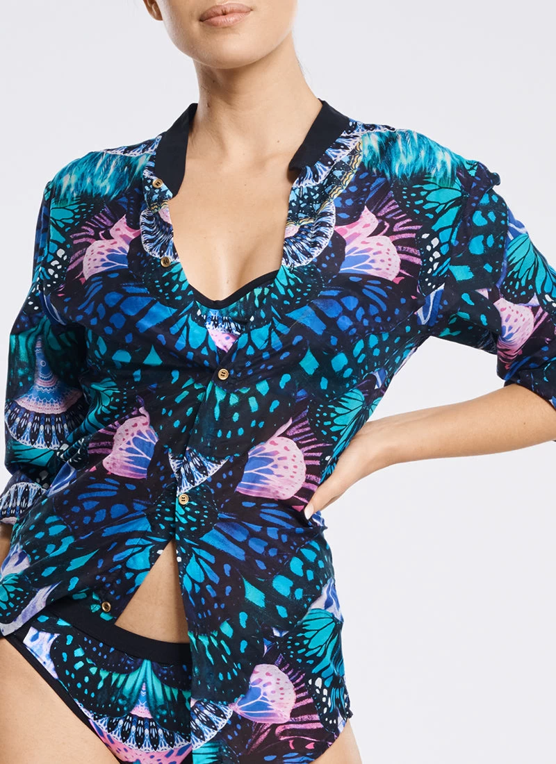 The Euphoria Resort Shirt by Aqua Blu Australia is the perfect shirt to be worn on long balmy nights. The shirt is made from natural fibres and features button through front and button-up cuffs.