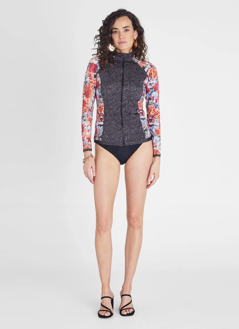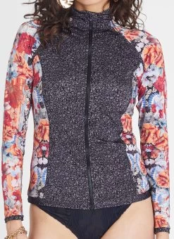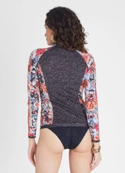 The Gardenia Hayley Rash Guard by Aqua Blu Australia is a bold departure from the classic rash guard with a high neck collar and tapping. Protects from harmful UVA & UVB rays with a UPF 50+ Sun Protection rating