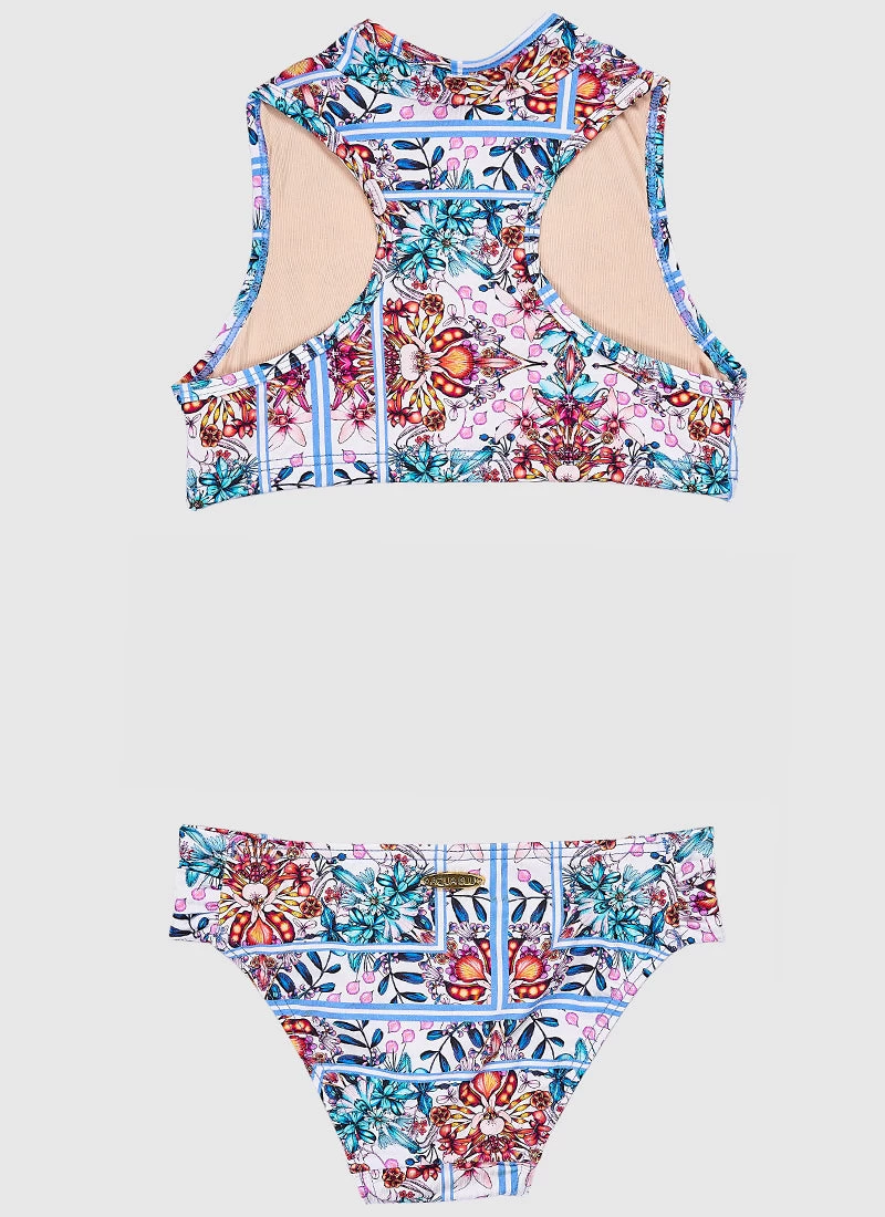 The Hideaway High Neck Bikini Set by Aqua Blu Australia is the ultimate bikini set for your active child featuring a high neck design, closed end front zipper and paired with classic gathered side bottoms.