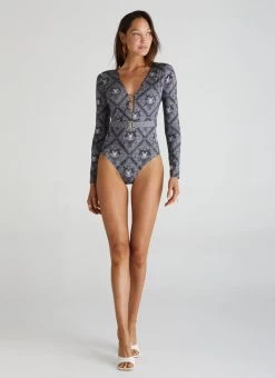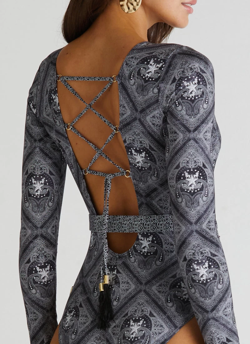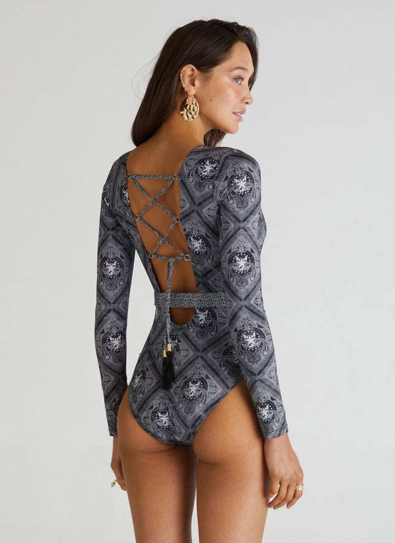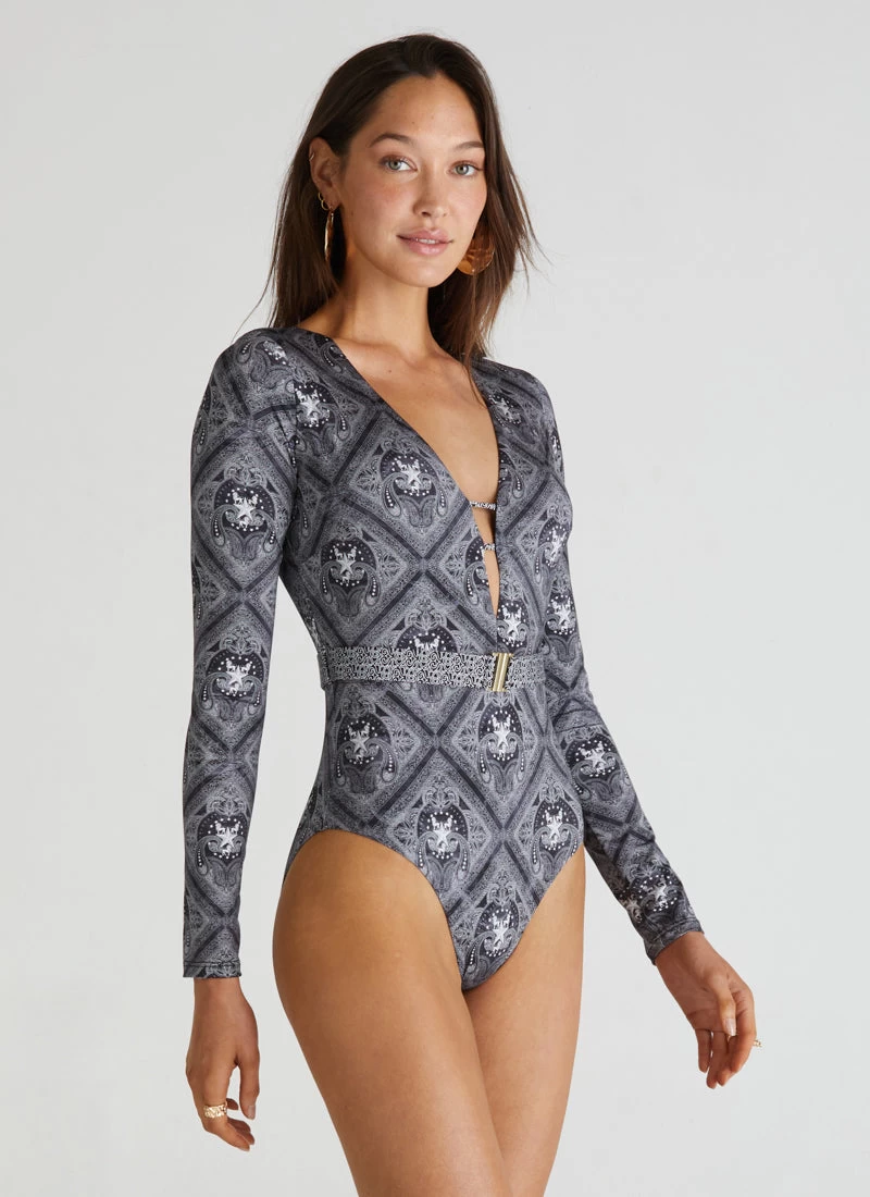 The Imperial Cleo One Piece by Aqua Blu Australia sets a new standard for swim with a deep V-neckline, gold clip belt detail and tie back style. The ultra-soft luxury fabric, removable cup support and full-length sleeve is designed to shape, support and protect the body from harmful UVA and UVB rays.