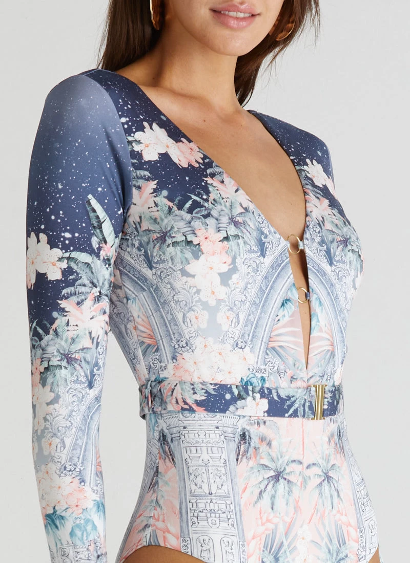 The Indianic Alexandria One Piece by Aqua Blu Australia features a deep V neckline front with a tassel tie back style, gold clip belt detail and deep square back design. The ultra-soft luxury fabric, removable cup support and full-length sleeve is designed to shape, support and protect the body from harmful UVA and UVB rays.