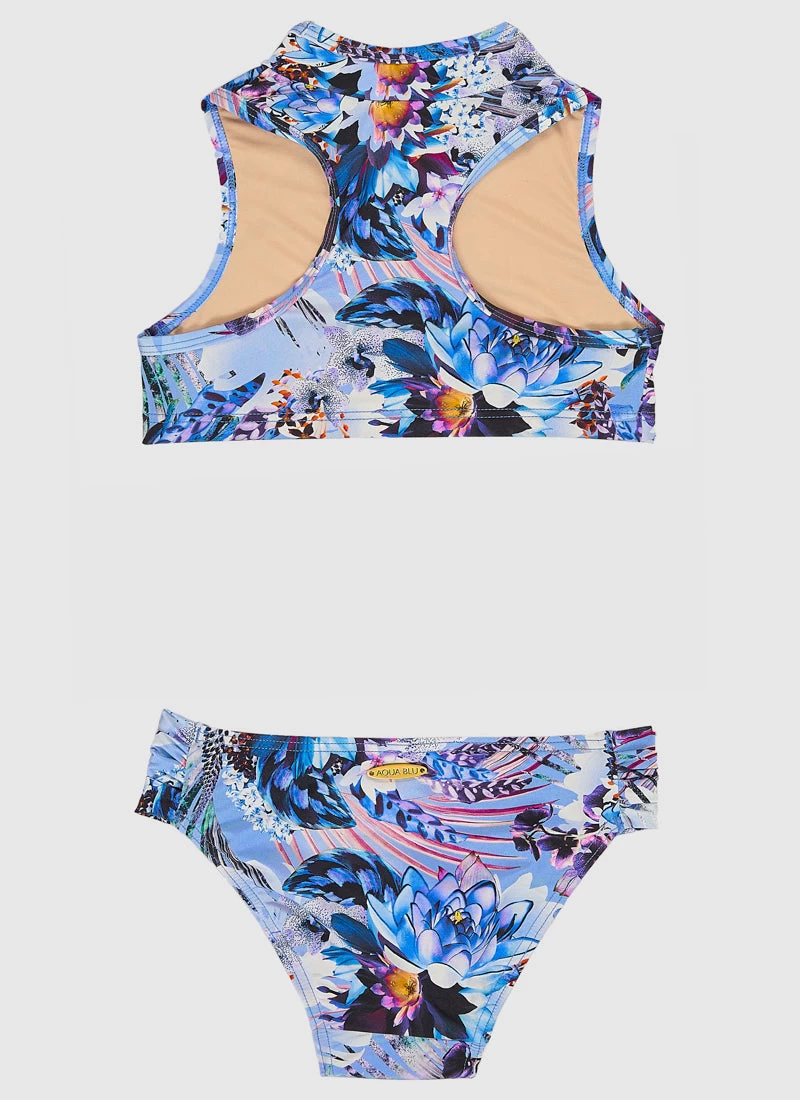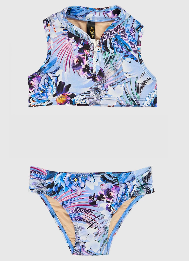 The Iris High Neck Bikini Set by Aqua Blu Australia is the ultimate bikini set for your active child featuring a high neck design, closed end front zipper and paired with classic gathered side bottoms.