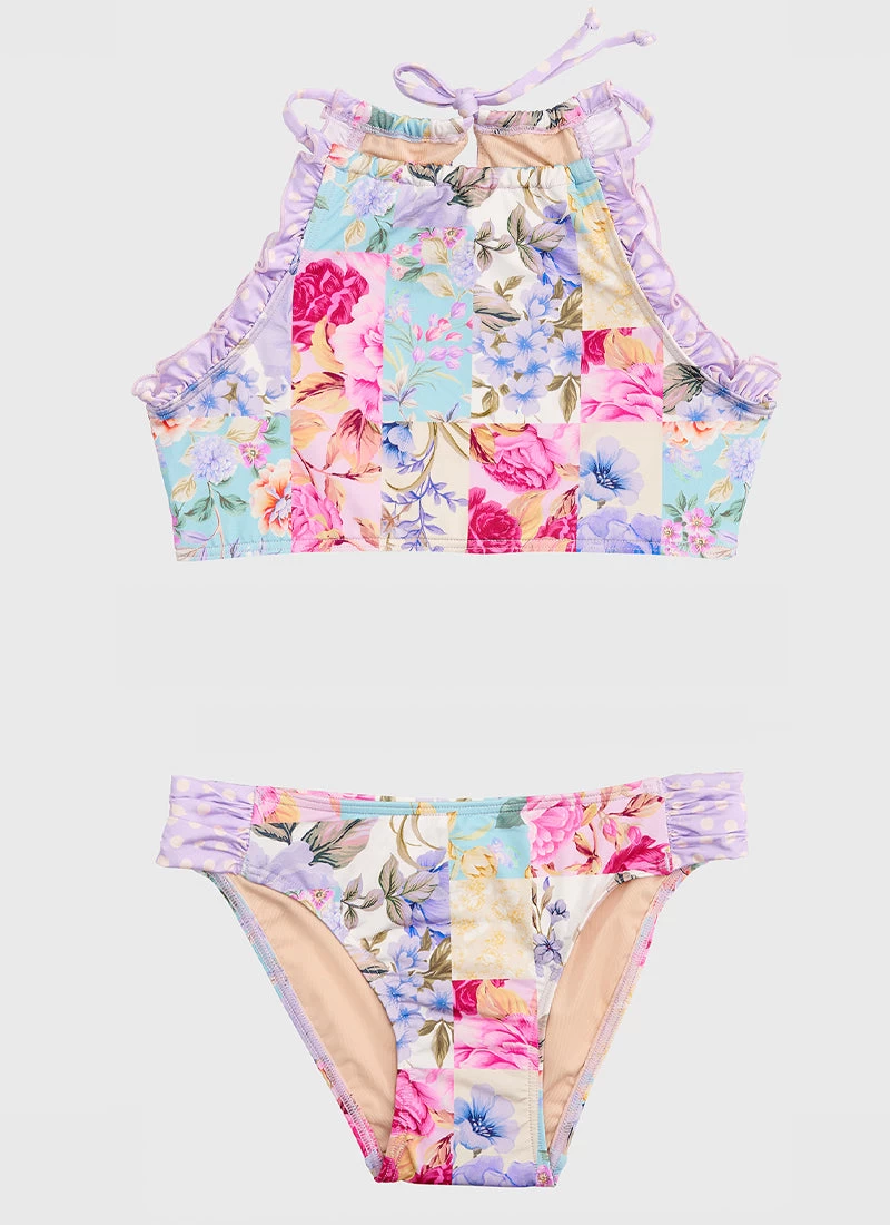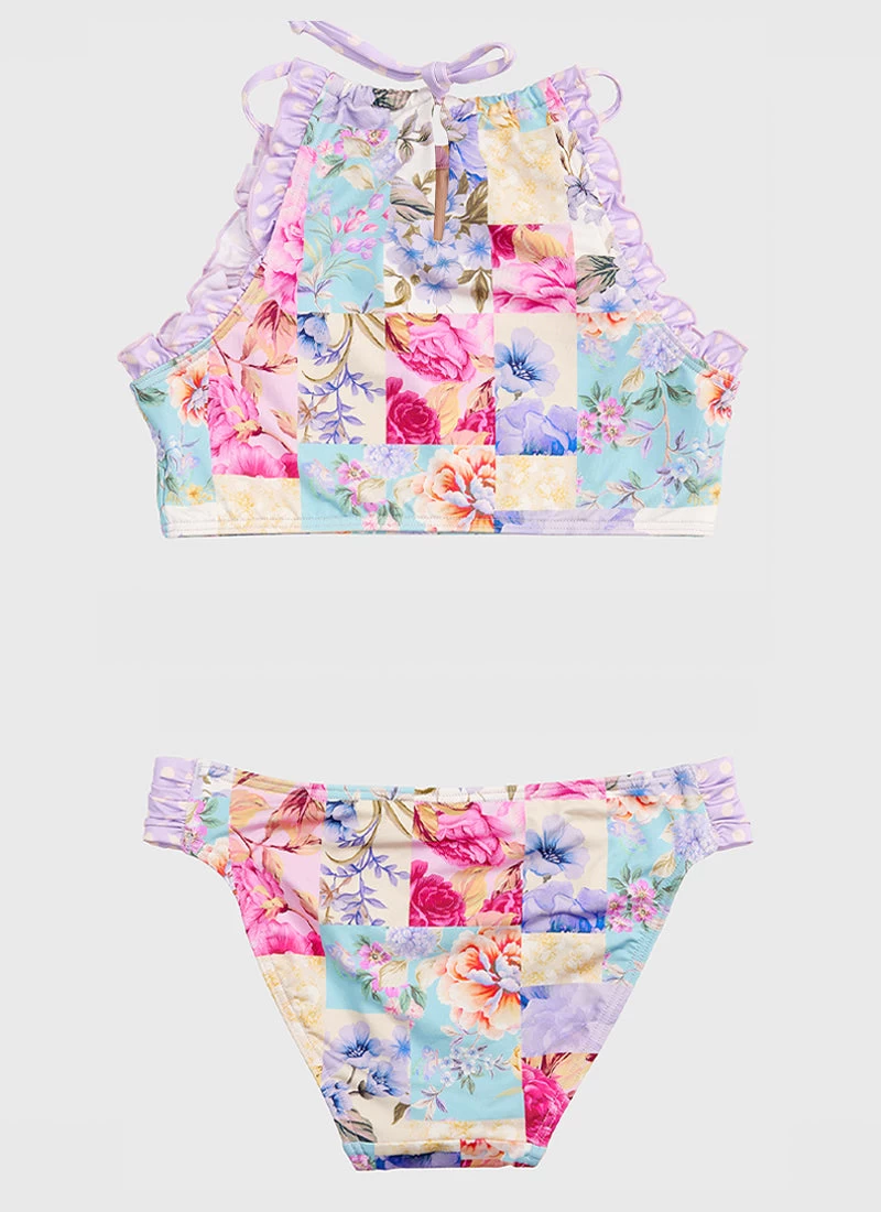 The Meadow Halter Bikini Set by Aqua Blu Australia is the ultimate bikini set for your active child featuring a high neck design and is paired with classic gathered side bottoms.
