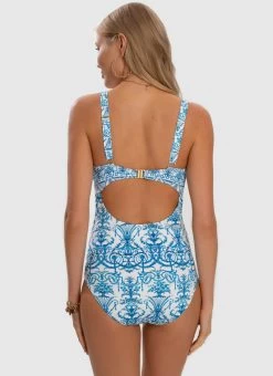 The Olympia DD/E Cup One Piece by Aqua Blu Australia embodies minimalist design with a moderate V neckline, wide adjustable shoulder straps and back clasp. The ultra-soft luxury fabric, removable cups, underwire support and front power mesh is designed to shape and support the body.
