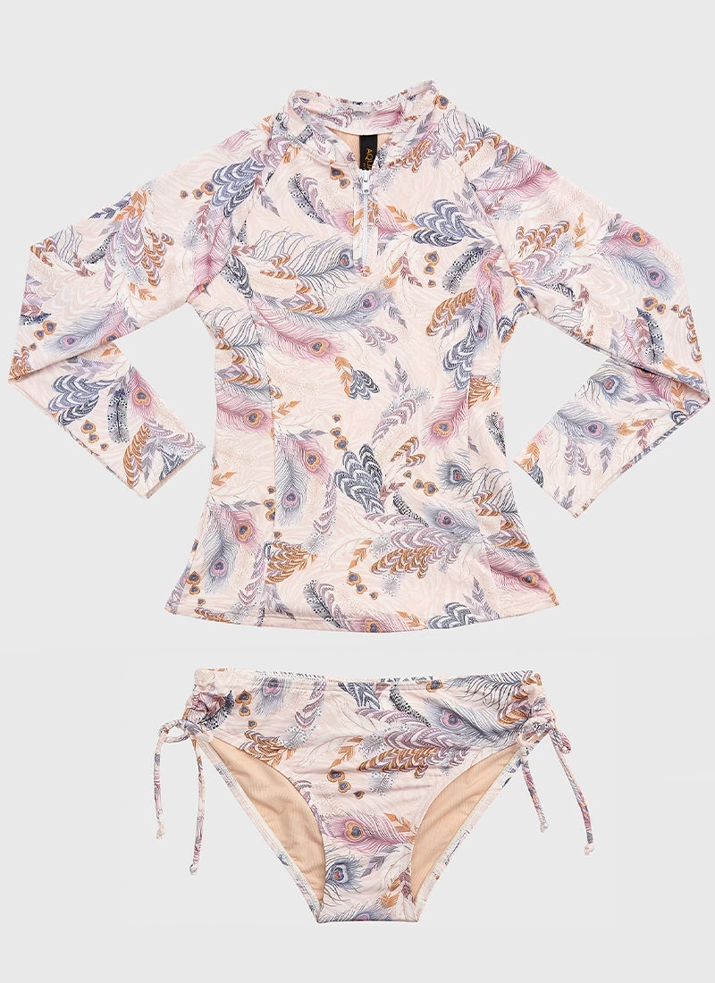 The Plumeria Rash Vest Set by Aqua Blu Australia is the ultimate two-piece set this Summer. This set features a sun safe tankini top with full length sleeves, paired with classic hipster bottoms.