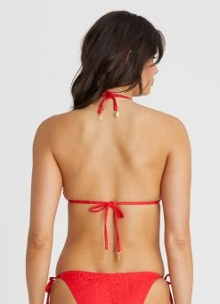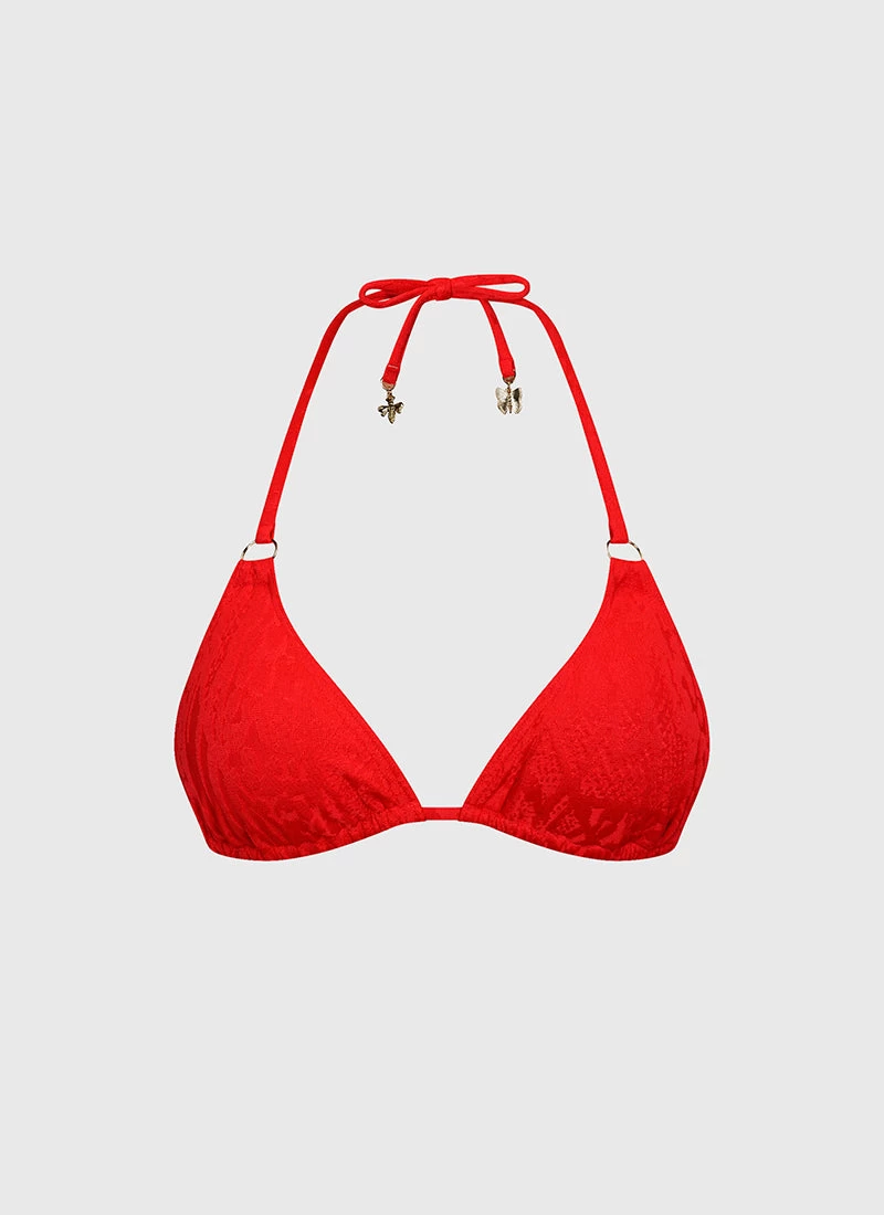 The Rossa Aurora Triangle by Aqua Blu Australia is the perfect blend of comfort and style. This classic triangle bikini top features removable cups for added versatility and a halter neck with adjustable tie neck and back to ensure the perfect fit. The charm detailing adds a touch of elegance and sophistication to this piece.