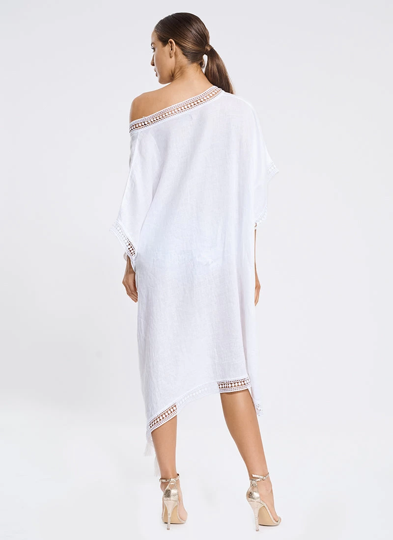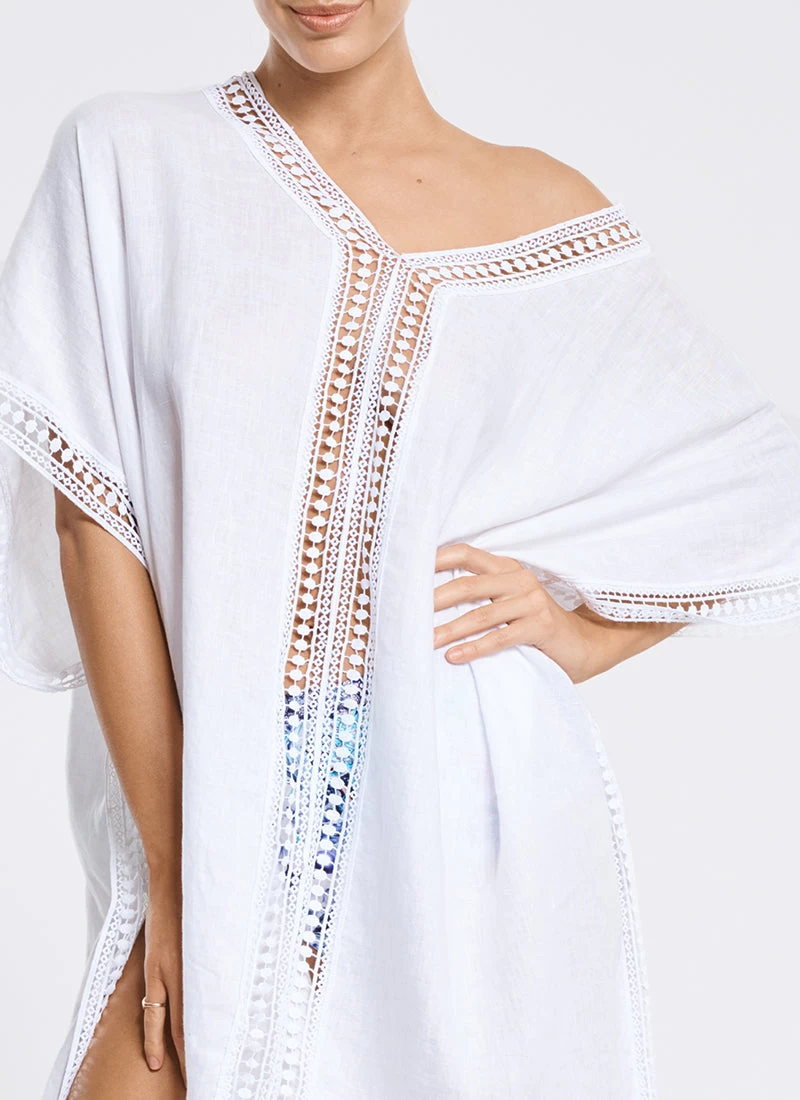 The Kaftan is will set you apart from the rest. The comfortable over-swim Kaftan features lace trim details and V-neck front