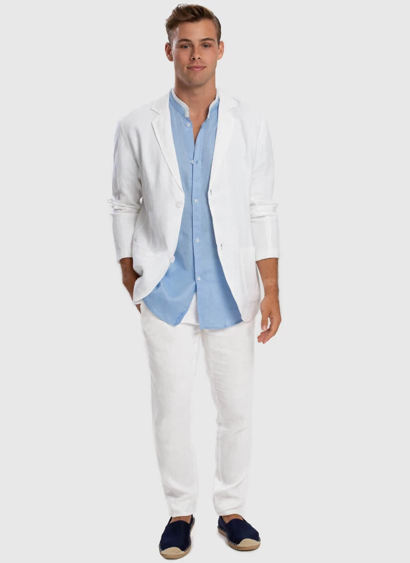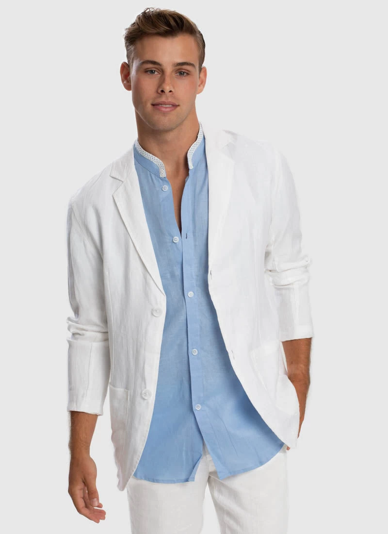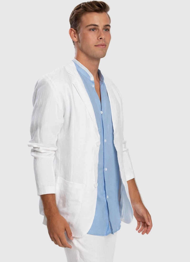 The Linen Jacket in White by Aqua Blu Australia is the ultimate jacket for warm balmy nights. This tailored blazer is engineered in 100% luxurious linen and features a two-button fastening and peak lapel collar and front packets.